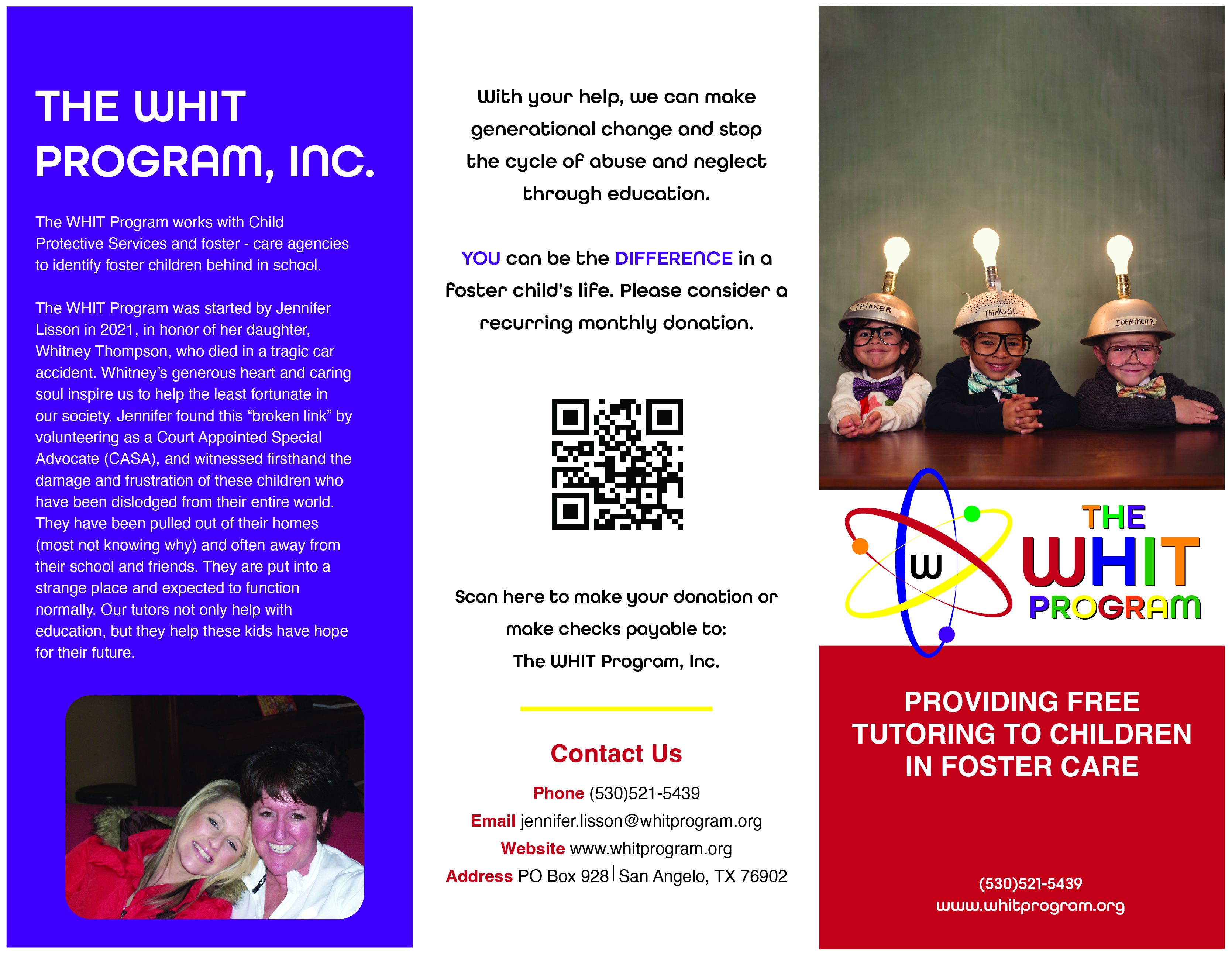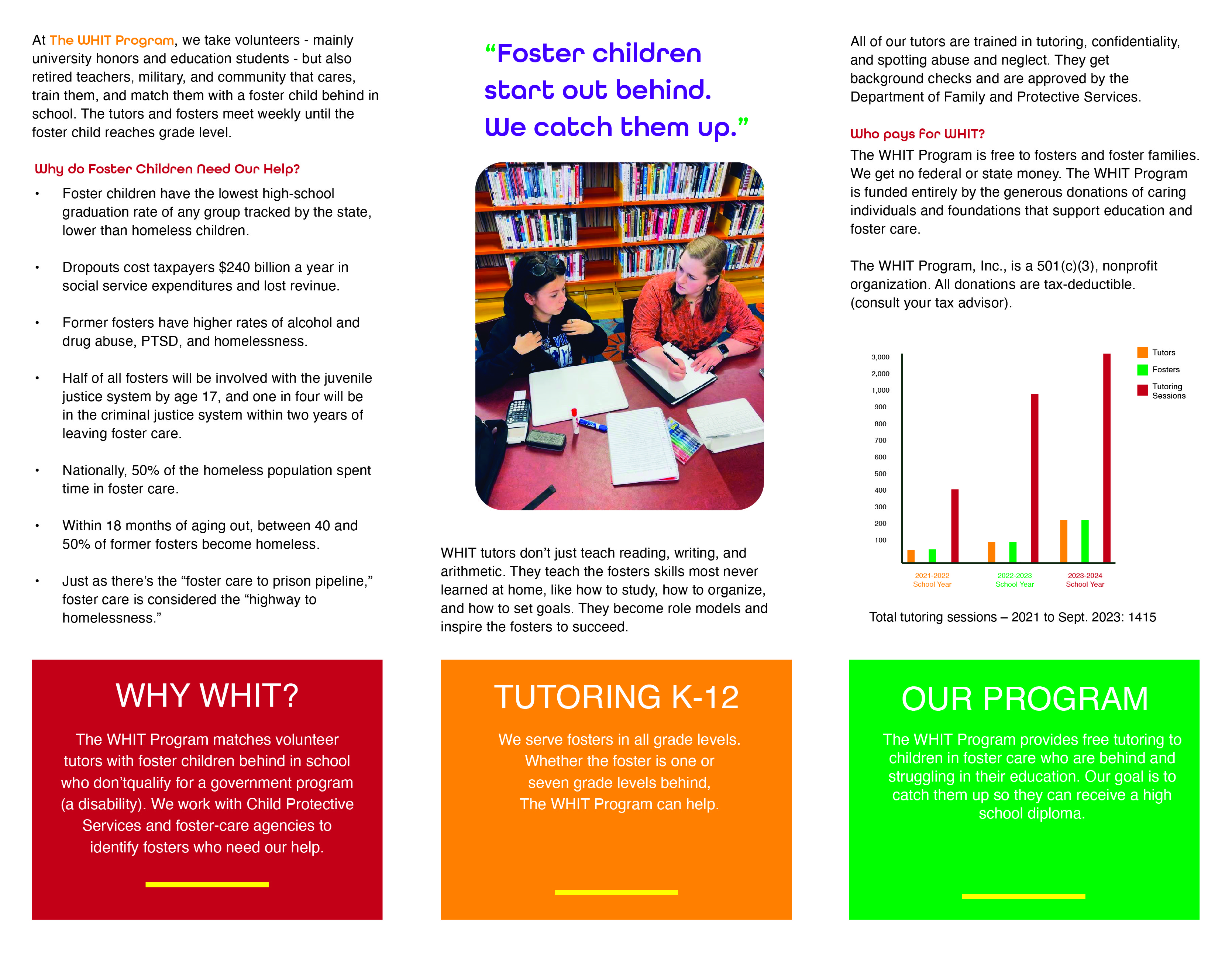 WHIT stands for, Weekly Hands-on Independent Tutoring. We are a non-profit organization that provides free tutoring to children in foster care. Children in foster care start off behind, we catch them up! The WHIT program achieves this goal by training volunteers, predominantly University students, to provide free tutoring for children in foster care to bring them up to grade level. We have 18 Universities across Texas that have students volunteering with our program. We can also provide reference for employment , or future education opportunities for WHIT tutors.