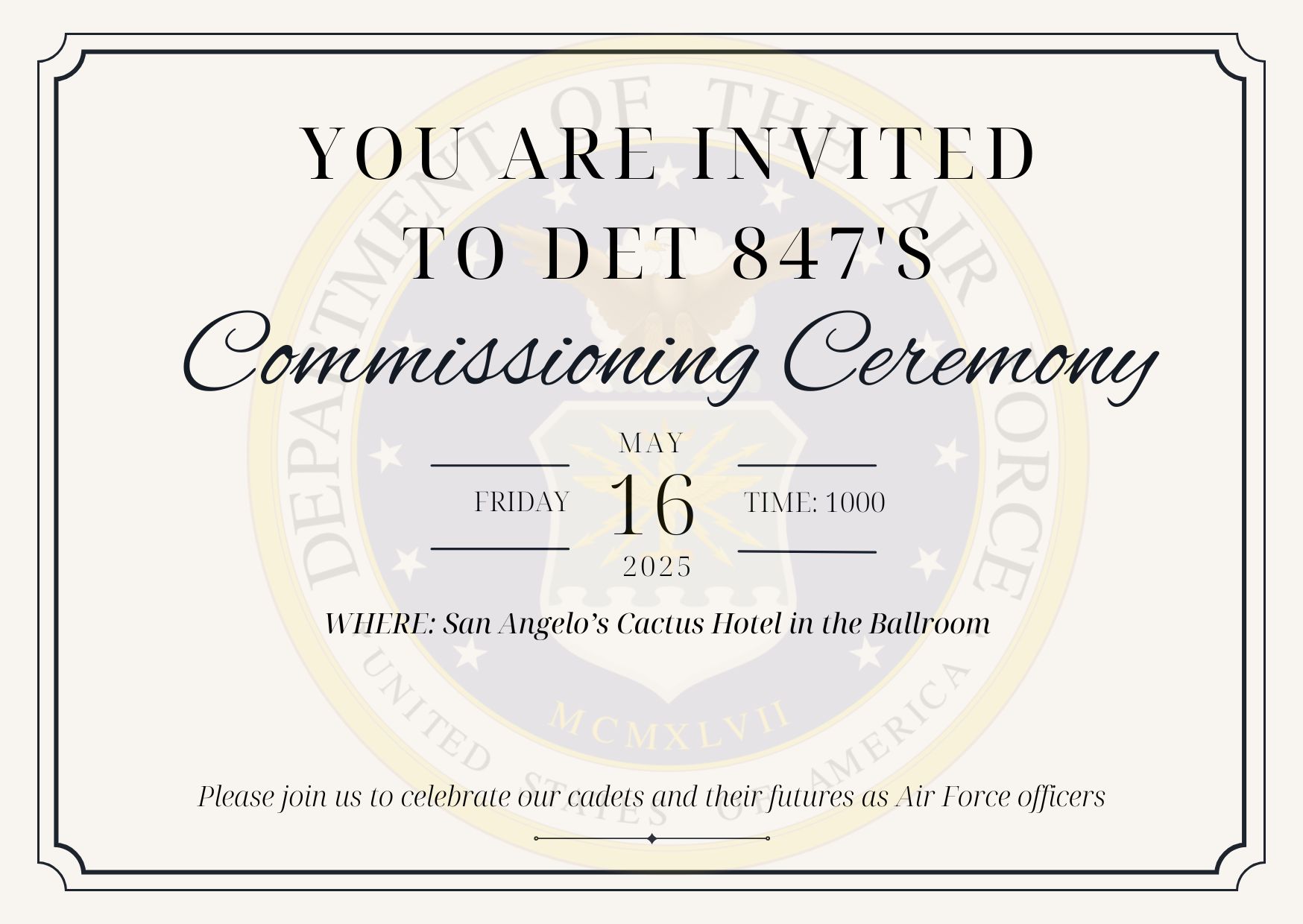 Good morning, ASU’s ROTC Detachment 847 extends an invitation to you all for this year's commissioning ceremony on 16 May/1000. It will take place at the Cactus Hotel this year. Ten cadets have dedicated years of commitment to the ROTC program, and we would be honored for you to join us in celebrating a momentous step to start their Air Force commissioned career. No need to RSVP, thank-you!